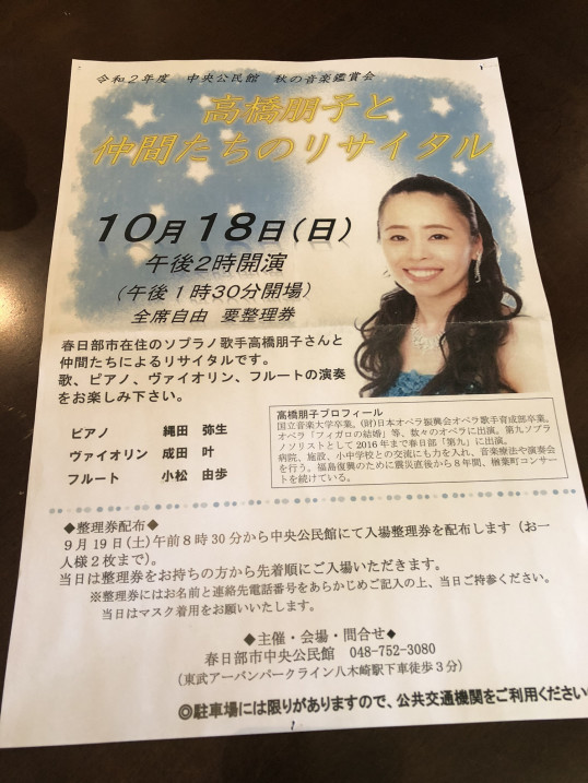 10月18日に春日部中央公民館で行われるリサイタルの整理券ですが、昨日の配布当日に、全部なくなりましたー😊😊